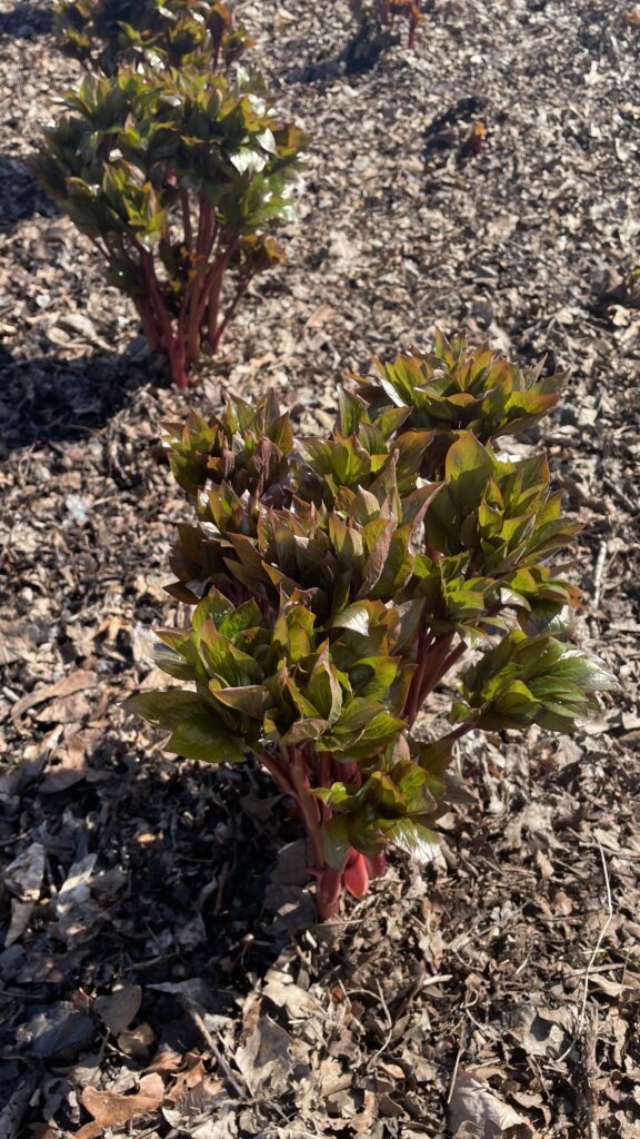 The peonies are emerging from the ground. Things are looking promising for this year. We have had a good winter, with enough cold hours — which are important for the growth of peonies. You are very welcome to come and visit us!